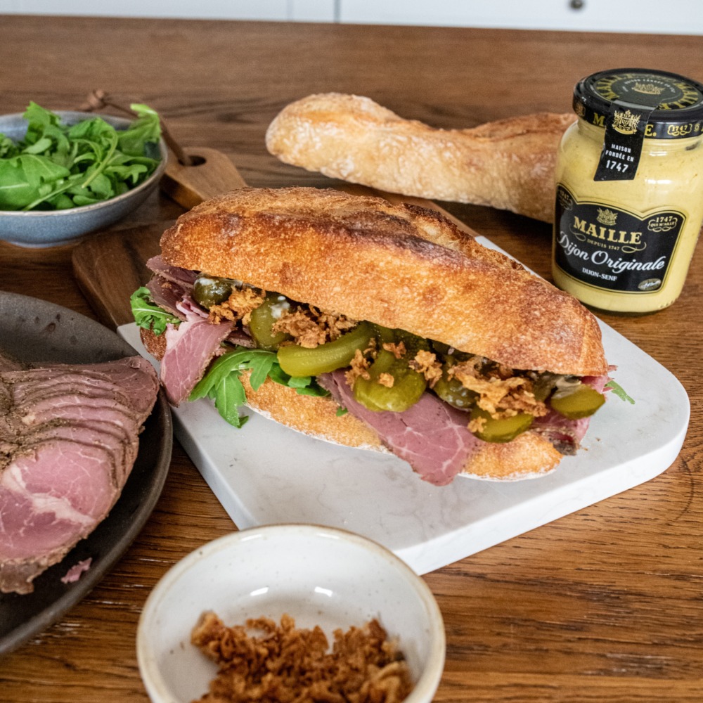 Bageta, která vás dostane na kolena. Křupavá, šťavnatá a plná chutí – díky dijonské hořčici Maille má tenhle recept šmrnc, na který jen tak nezapomenete. Stačí zapéct bagetu, připravit si majonézu s hořčicí, přidat pastrami nebo roastbeef, křupavé cornichons, trochu rukoly a sušenou cibuli. Výsledek? Dokonalý street-food zážitek doma.